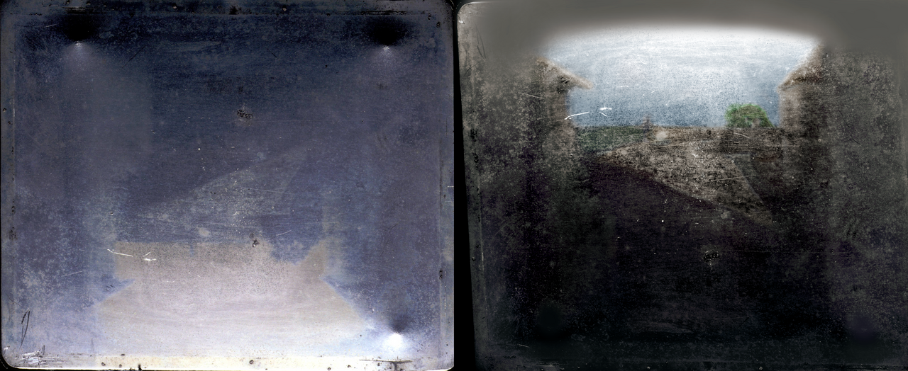 Tecnica: lastra di peltro di dimensioni ~16*20cm, Eliografia. La lastra è ricoperta di bitume di Giudea. Il bitume si indurisce nelle aree illuminate, mentre nelle aree scure rimane solubile e viene rimosso attraverso una miscela di olio di lavanda e petrolio bianco. Esposizione necessaria di almeno otto ore, dagli appunti di Niépce l’esposizione è durata diversi giorni.