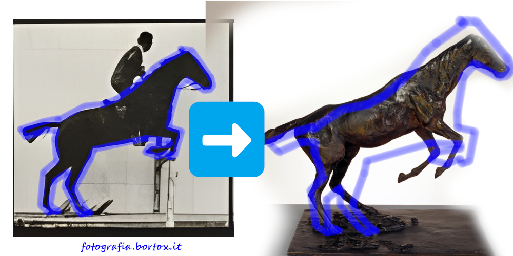 Come è possibile vedere, Muybridge si è ispirato ad uno scatto per la parte sinistra del cavallo, mentre in nessuno scatto il cavallo, in procinto di saltare, tiene gli arti anteriori visibilmente paralleli. Utilizzando la fotografia, interpretazione oggettiva della realtà , assieme all’immaginazione, antitesi dell’oggettivo, Degas ottiene un prodotto che è al tempo stesso sia unione di fotografia e immaginazione sia qualcosa di completamente diverso, come nel processo hegeliano per il raggiungimento dell’Assoluto.