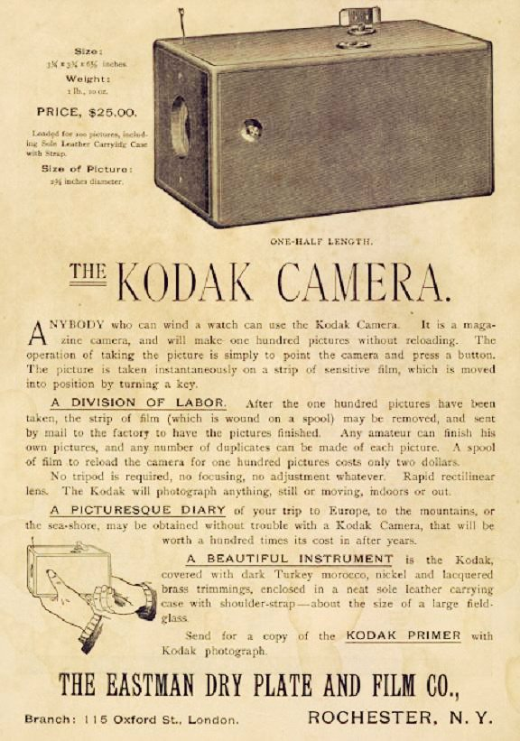 La Fotocamera Kodak costava $25 al tempo, un prezzo elevato per il periodo; nel 1900 le camere Kodak (Brownie) a pellicola in rotolo costeranno solo $1. La prima fotocamera Kodak fu un passo chiave per diffondere l’attività della fotografia nella popolazione generale.